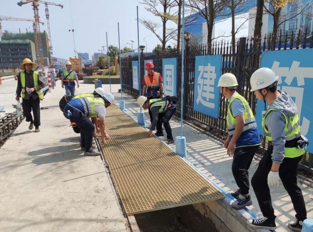 青年突击队队员为施工现场的排洪渠安装临时盖板。熊朝朝/摄