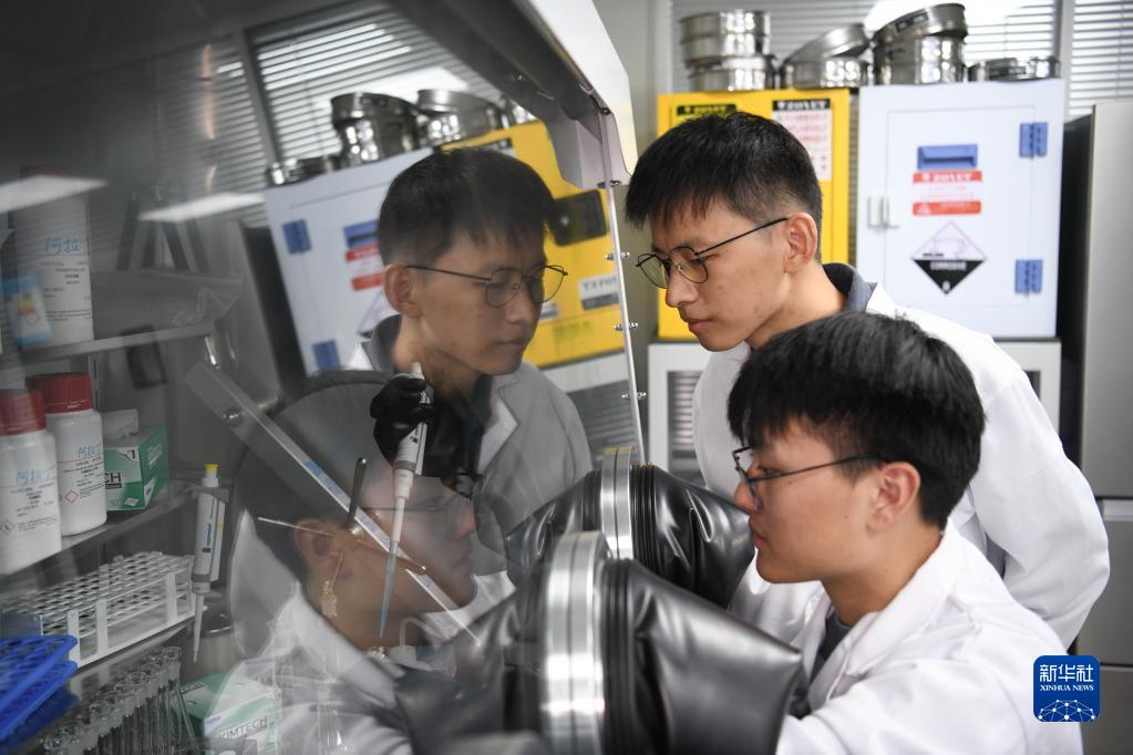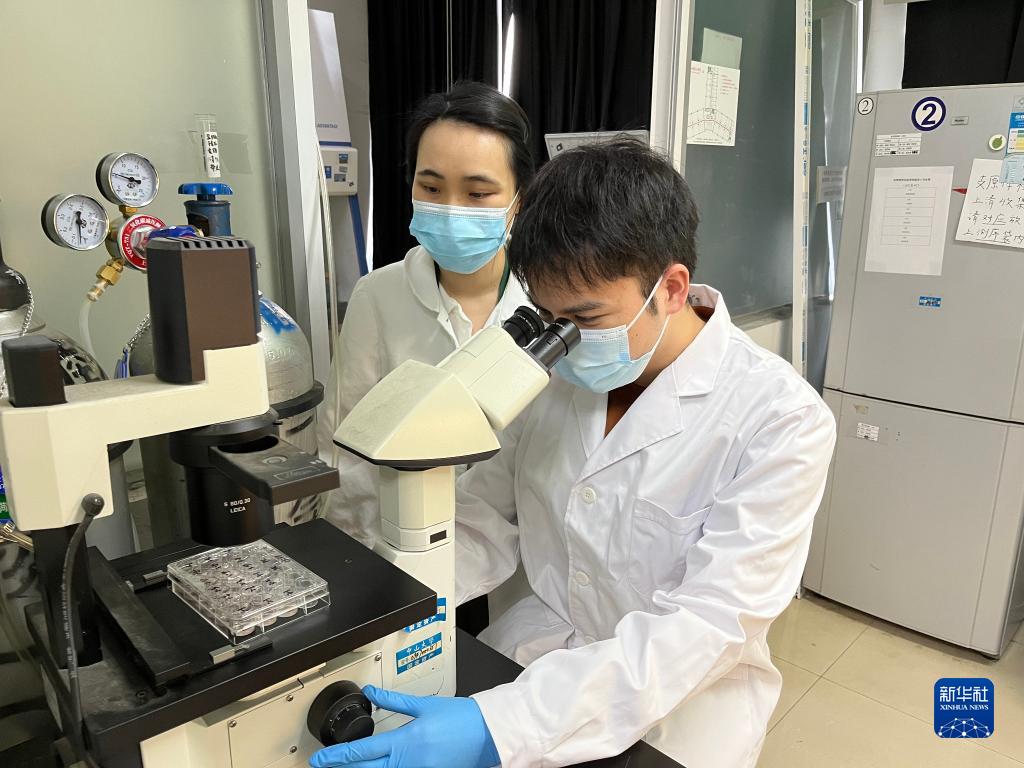 10月20日,广东中山大学中山医学院博士研究生张贤涛(右)在实验室。新华社发