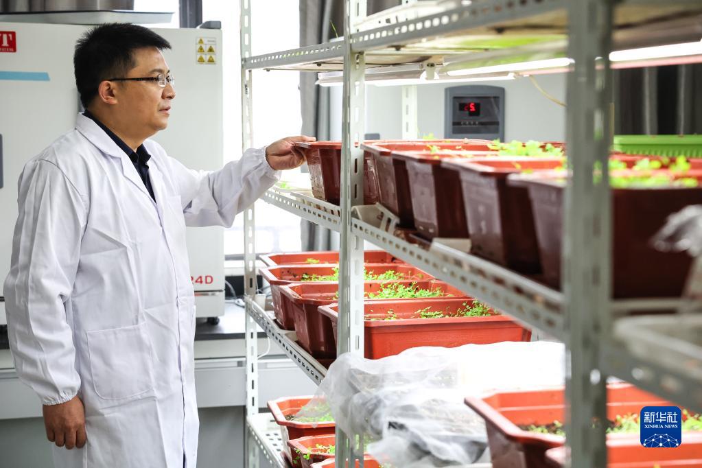 10月20日,贵州大学动物科学学院院长陈超在实验室内观察新品种牧草的生长情况。新华社记者 欧东衢 摄