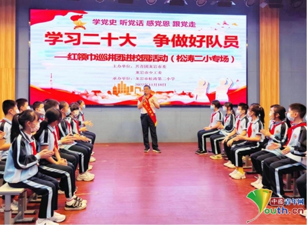 近日,共青团福建省龙岩市委、龙岩市少工委走进龙岩市松涛第二小学,举办“学习二十大争做好队员”——红领巾巡讲团进校园活动。活动现场邀请第二届全国文明家庭获得者、福建省优秀少先队辅导员、福建省红领巾巡讲团成员廖志添作宣讲。