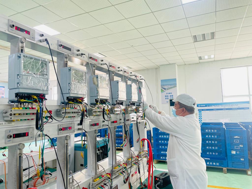 2022年12月,在威胜集团有限公司生产车间内,工人对智能电表进行校验。(受访者供图)