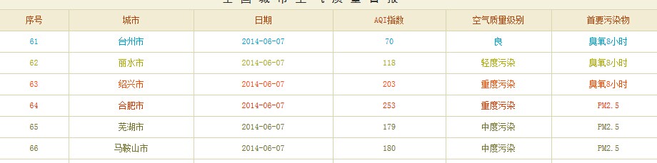 2014年6月7日,中华人民共和国环境保护部统计合肥市空气质量严重污染。